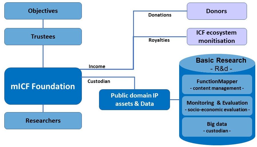 - Procure funding contributions for the objectives of the Foundation, individually or collectively. However, ensure that no funding contribution may result in alienation of any IP rights of the Foundation (core IP, ICF codes and data) or the mICF ecosystem (IP applications, DApp).